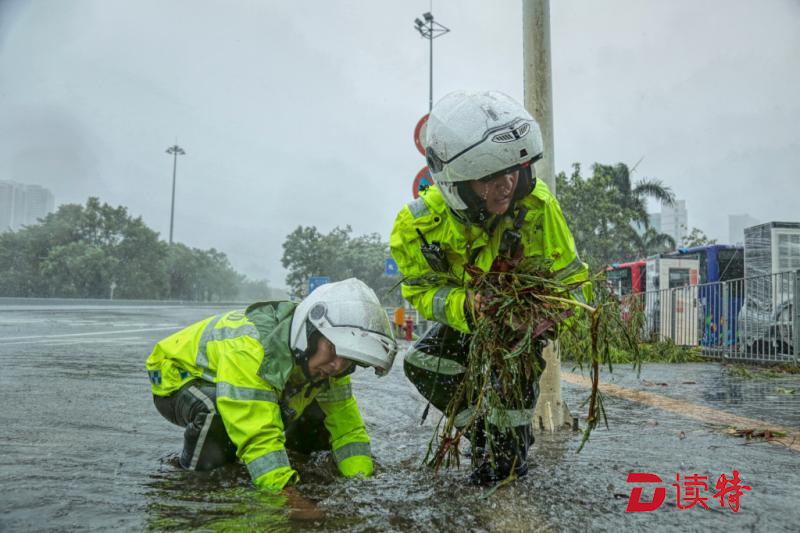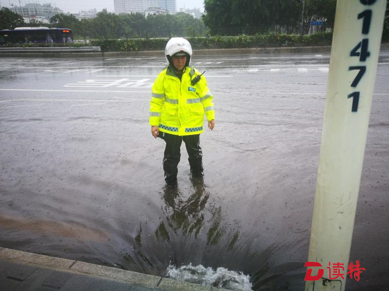 但是,眼前的情況,他們無法視而不見。深鹽二通道下方,羅沙路羅湖公安分局調(diào)頭口處,當(dāng)艾力軍經(jīng)過這里時發(fā)現(xiàn)由于地勢低洼路面已經(jīng)嚴(yán)重積水,他們馬上停下車,疏通下水道。一行人在風(fēng)雨中走進機動車道,沿著路邊只能用手在積水中摸索排水口的位置,將阻塞入水口的樹枝樹葉掏出來。但風(fēng)急雨驟,道路積水水位剛下降一點,剛被清理的下水道又堵樹葉、樹枝等雜物堵上,他們只好不斷地進行著重復(fù)的動作。而此時,臺風(fēng)“山竹”距離深圳接近130公里,羅湖片區(qū)測得最大陣風(fēng)達16級。