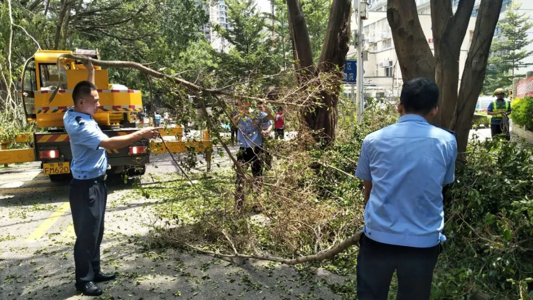 9月19日上午,福田區(qū)百花二路、三路,60多名身著藍色制服的警察和紅色馬甲的輔警格外顯眼,他們正在揮汗如雨地進行災后路障清理工作。