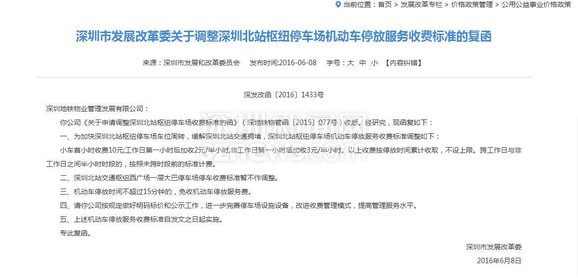 2016年深圳市發(fā)改委調(diào)整深圳北站停車(chē)收費(fèi)政策