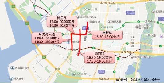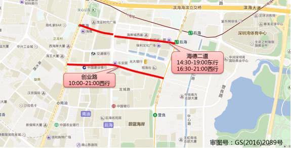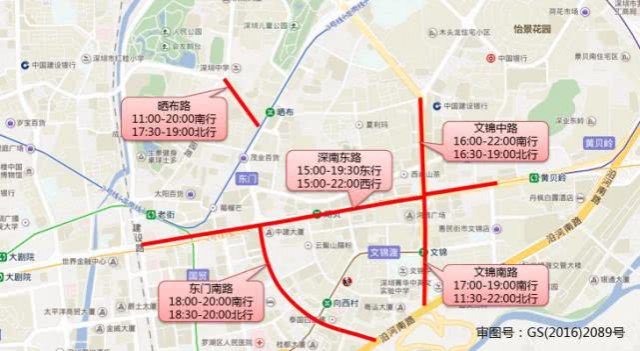 華強北路(13:30-17:00南行,10:00-17:30北行),華富路(17:00-21:00南行,16:00-17:30北行),振華路(16:00-19:00東行,13:30-22:30西行),上步中路(15:00-17:00北行),深南中路(16:00-19:00東行),上步南路(10:00-19:30南行,13:00-15:00北行,19:30-22:00北行)。