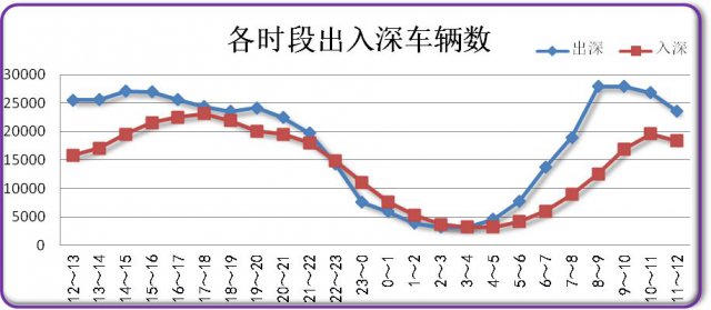 繼22日出入深平穩(wěn)有序的狀況,今天目前我市主要出入深道路運行正常,從6時開始,出深車流開始增加,8時至9時達到峰值,達2.8萬輛次,整體行車狀況較好,道路較為通暢。