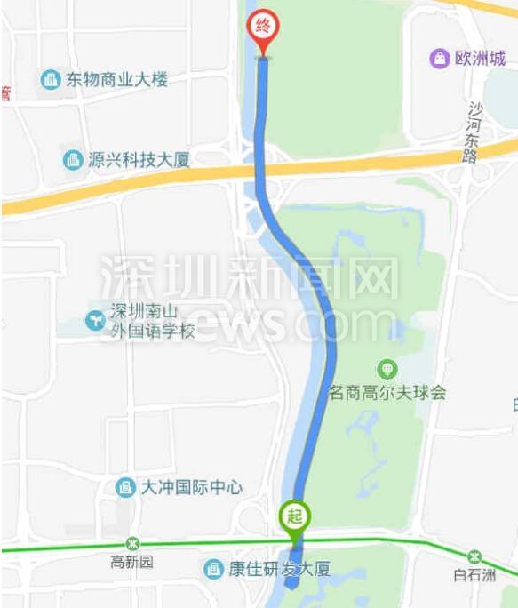 該網(wǎng)友在帖文中稱,聽聞濱海沙河西立交橋下到深南沙河西天橋的騎行路段今年9月份開通了,于是他周末帶著孩子沿沙河?xùn)|側(cè)騎行,準(zhǔn)備一睹深圳最美騎行路段的風(fēng)景。由于周末限騎行原則,該網(wǎng)友被迫輾轉(zhuǎn)數(shù)次才到達大沙河公園。具體騎行路程如下: