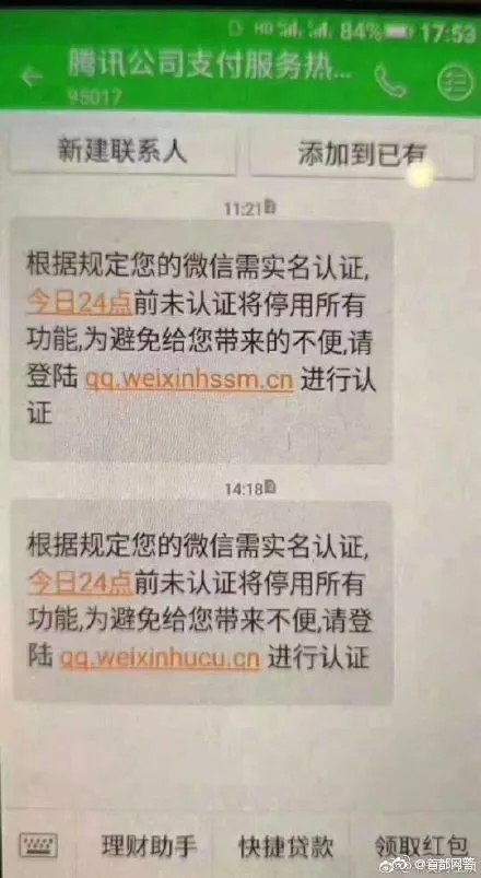 兩條短信中的實(shí)名認(rèn)證網(wǎng)址不一樣!