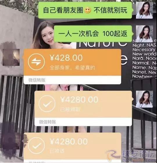 " 美女 " 們無一例外都有一個(gè) " 富二代 " 男友,分個(gè)手動(dòng)不動(dòng)就甩來 30 萬、50 萬。而美女本身就是高富美,誰稀罕他的臭錢,只要轉(zhuǎn)賬并備注 " 馬少輝是人渣 " 就能收到十倍返還。當(dāng)然也可能是 " 王少輝 "、" 孫少輝 "…… 隨便一個(gè)名字而已。