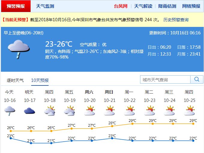 深圳市氣象局提醒,16日 ~17日陰天有雨,雨天路面濕滑能見度差,對交通影響較大,需注意防范降雨對上班高峰期帶來的不利影響。預(yù)計(jì)17日重陽節(jié)早晨仍有分散小雨,路面濕滑,戶外登高要注意防滑保暖。