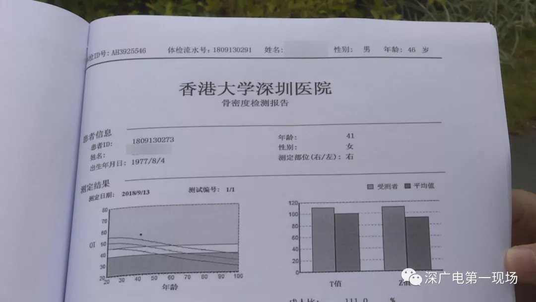 李先生也向記者展示了自己的這份體檢報告,在體檢報告的封面上,確實是李先生的信息,然而就在骨密度的檢查結果頁面中,顯示了一位女性的個人信息,其中名字年齡都有,但是在頁眉上,還是李先生的體檢流水單號。