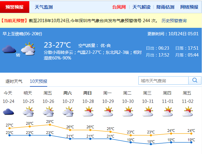 本周中后期,深圳早晚清涼,中午炎熱,最高氣溫維持在28℃-29℃,最低氣溫22℃-23℃,溫差增大,市民應(yīng)注意預(yù)防感冒。本周末,受南下冷空氣影響,深圳最高氣溫回落至26℃左右,天氣較為舒適。