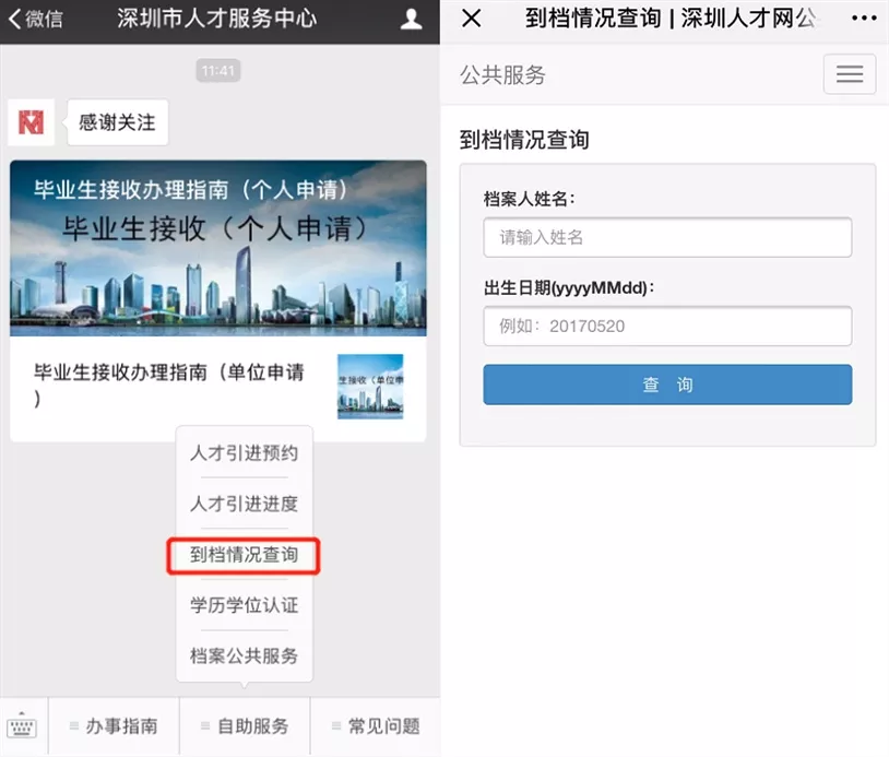 關(guān)注“深圳市人才服務(wù)中心”公眾號(hào)查詢(xún)到檔情況,辦理檔案相關(guān)業(yè)務(wù)。