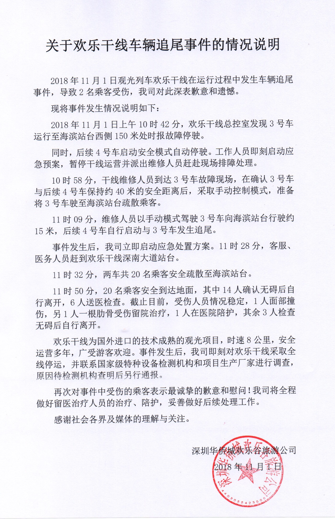 11月1日19時(shí),歡樂谷旅游公司發(fā)布追尾事件情況說明,并向受傷乘客表示歉意。目前歡樂干線已全線停運(yùn)。