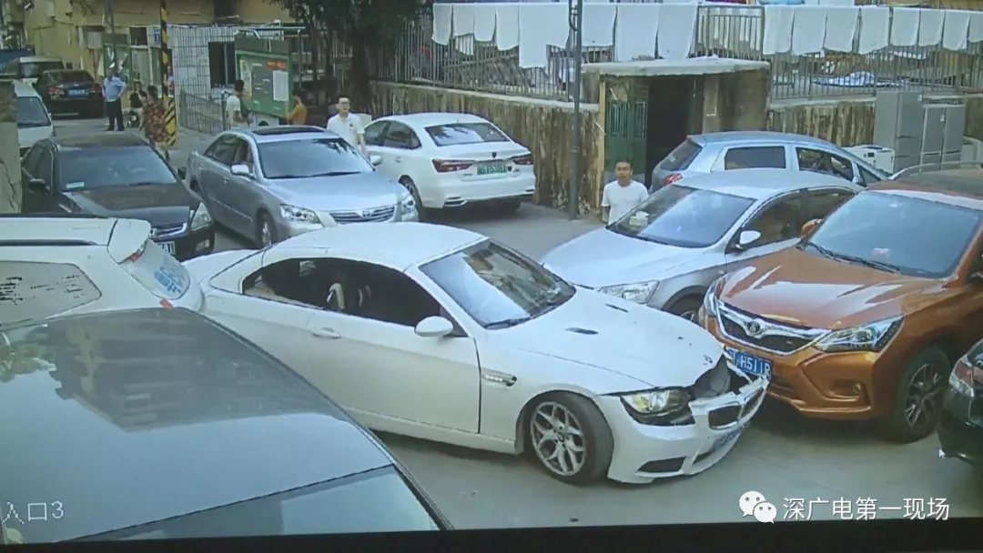 從監(jiān)控畫面中可以看到,粵E牌白色寶馬小車,在原本就擁擠的停車路段內(nèi),不停地前進(jìn)倒退,走著奇怪的路線,在倒車時(shí)他接連將停放路旁的車輛撞了個(gè)遍,隨后便卡在了路中。
