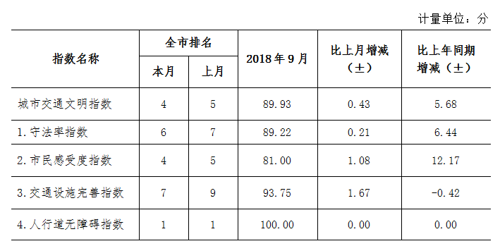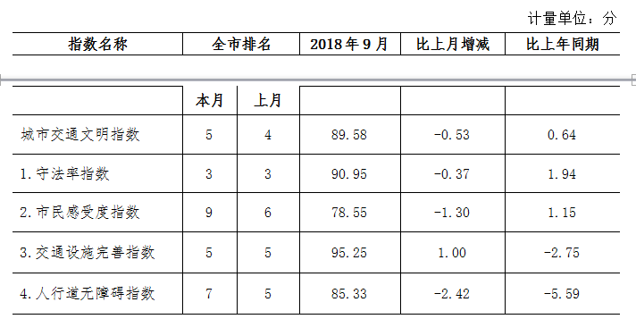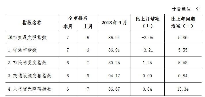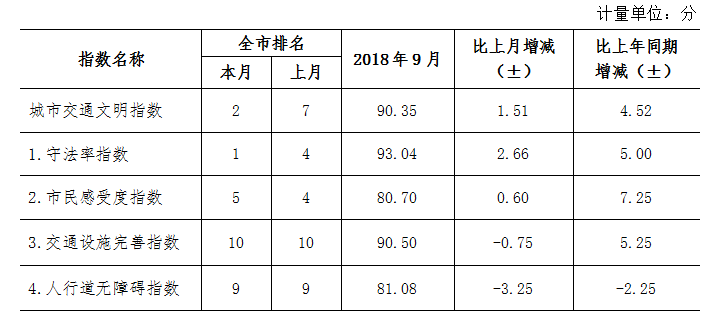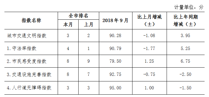9月份深圳市城市交通文明指數(shù)為87.02分。與上月對比,四項(xiàng)分項(xiàng)指數(shù)呈“三升一降”現(xiàn)象。