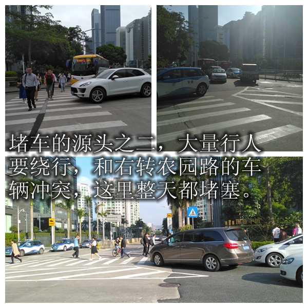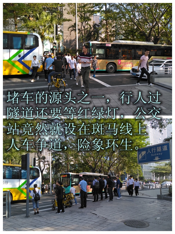 而在進入人行隧道前,又需要等紅綠燈,且公交車站就設(shè)在這紅綠燈前的斑馬線上?!拔也幻靼诪楹卧诮煌ㄟ@樣混亂的地方,要設(shè)置公交車站,也不知為何‘為難’的都是市民?!本W(wǎng)友“深圳大胡子”為這里每天通行的行人鳴不平,他希望能把招商銀行公交站原來的港灣式站臺恢復(fù),方便市民乘車,也希望能盡快恢復(fù)正常的過街通道。