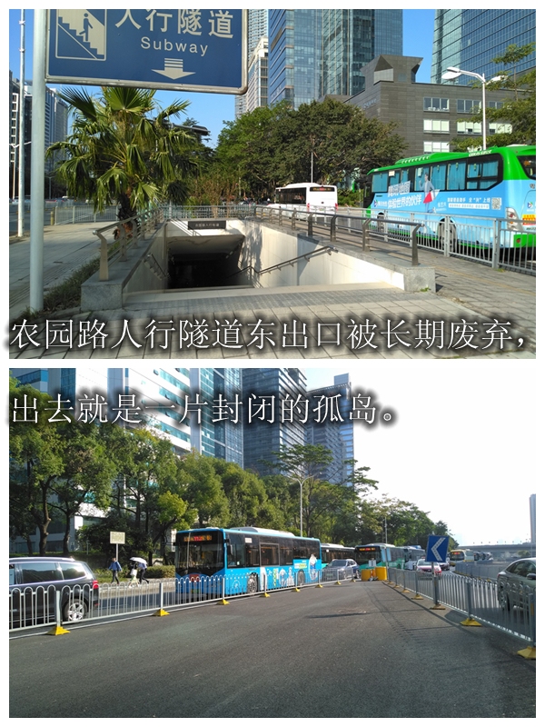 自2017年連通深南大道兩側(cè),可供行人通行的人行天橋被拆卸后,行人都只能從人行隧道過街。但奇怪的是,人行隧道的東出口處是一片被隔離、被荒廢的“孤島”,這讓需要從此出口通行的市民很尷尬。即使避開這個出口,選擇繞行,又容易在農(nóng)園路口與右轉(zhuǎn)車輛發(fā)生沖突?!罢娴暮転殡y我們啊?!笔忻駞窍壬C實了步行通過該路段的“艱難”。