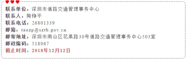 根據(jù)《深圳市機動車道路臨時停放管理辦法》相關(guān)規(guī)定,市交委現(xiàn)就以上18條道路路邊停車泊位設(shè)置方案公開征求意見。市民如有意見和建議,可于2018年12月12日前反饋給市交委。郵寄地址為深圳市南山區(qū)花果路30號道路交通管理事務(wù)中心503室。