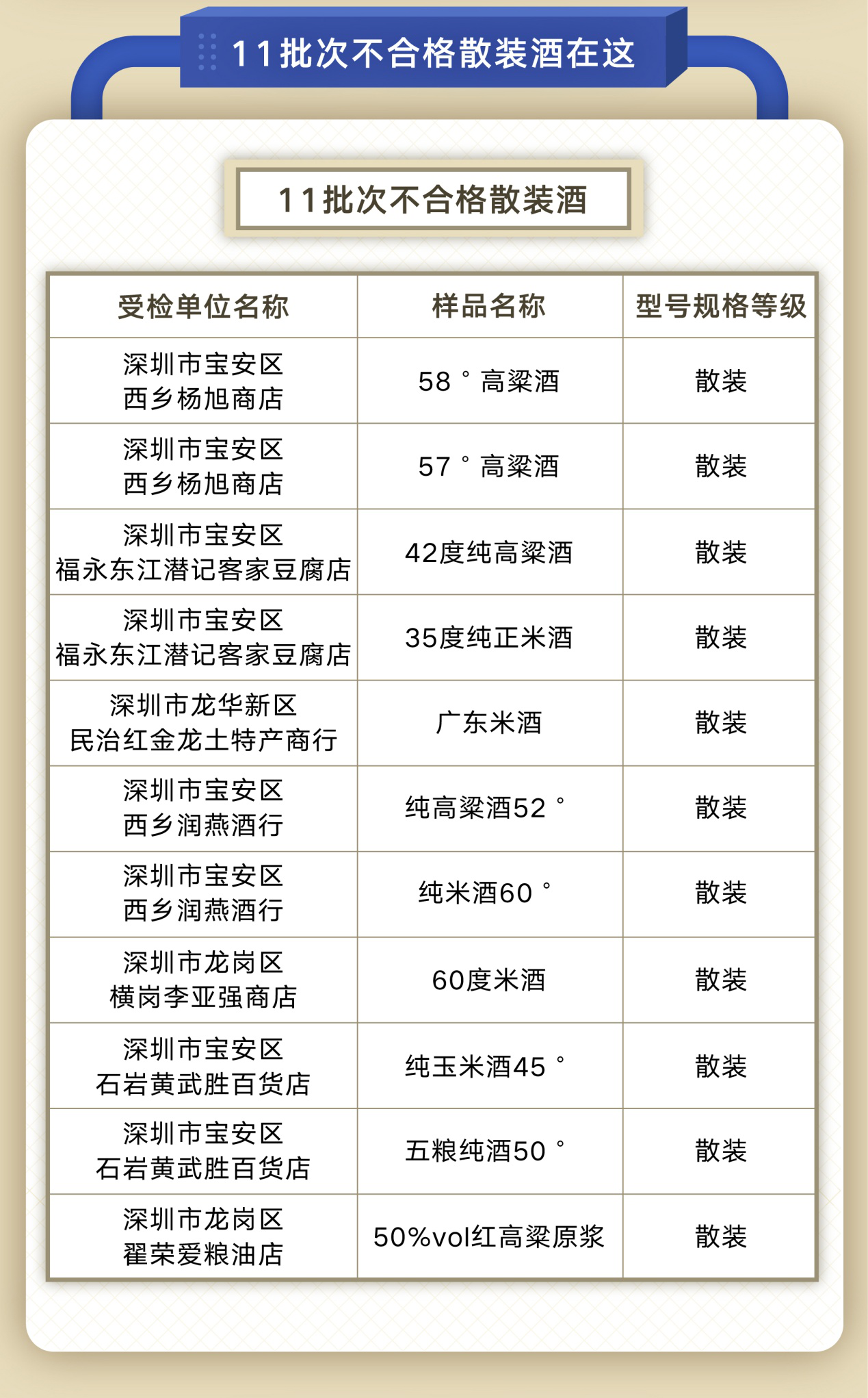 根據(jù)投票結(jié)果,此次共抽檢各類散裝酒143批次,11批次不合格,合格率92.3%。其中,抽檢白酒23批次,合格率100%;抽檢高粱酒60批次,5批次不合格,合格率91.67%;抽檢米酒51批次,不合格6批次,合格率88.2%。