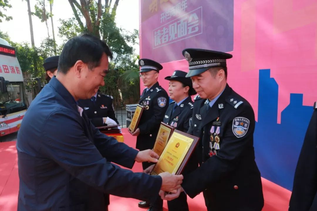 深圳市公安局與深圳特區(qū)報(bào)合辦的“每日警星”專欄讀者粉絲見(jiàn)面會(huì)在福田分局開(kāi)放點(diǎn)火熱開(kāi)展,來(lái)自深圳警隊(duì)刑偵、掃黑攻堅(jiān)、治安、社區(qū)、特警、交警、預(yù)審等各個(gè)崗位的14名“每日警星”代表現(xiàn)場(chǎng)激情合唱中國(guó)人民警察警歌;徐文海與深圳報(bào)業(yè)集團(tuán)黨組副書(shū)記、副社長(zhǎng)、總編輯周斌共同為“每日警星”代表頒發(fā)紀(jì)念牌。
