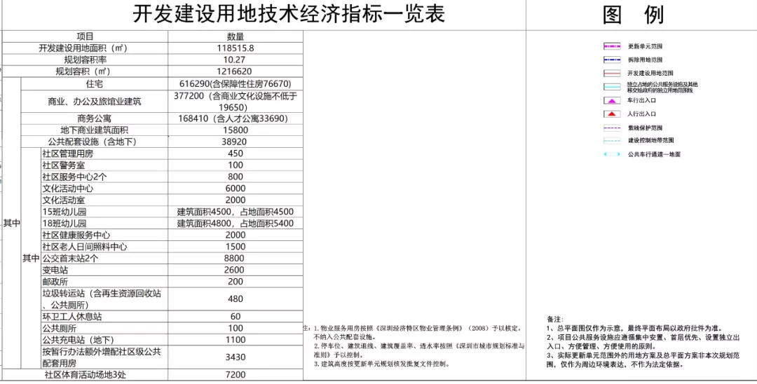 該項(xiàng)目更新單元用地面積189094.9㎡,拆除用地面積185639.0㎡,開發(fā)建設(shè)用地面積118515.8㎡(含劃入零星用地817㎡),規(guī)劃容積(含地下規(guī)定建筑面積)調(diào)整為1216620平方米,容積率達(dá)10.27。