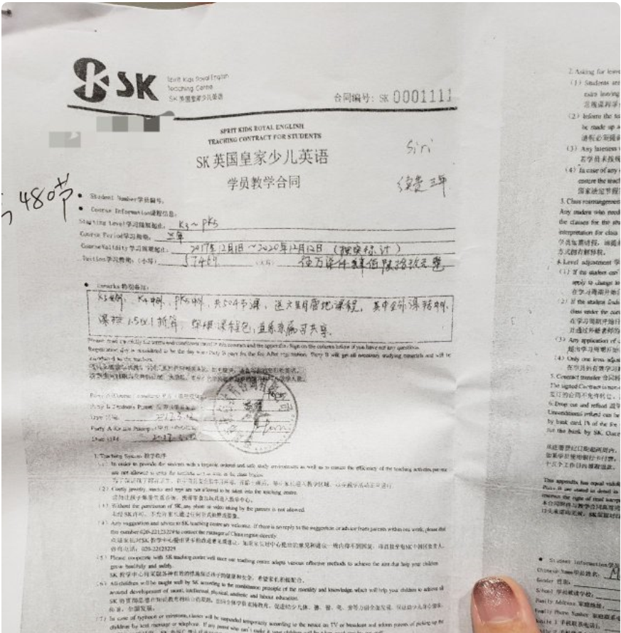 12月2日,家住福田區(qū)的徐先生照常把孩子帶到香蜜湖1979文化創(chuàng)意園的"SK英國(guó)皇家少兒英語(yǔ)"上課,沒(méi)想到到了課堂卻收到一紙停課通知。工作人員告訴徐先生,由于經(jīng)營(yíng)不善,機(jī)構(gòu)老板決定停止授課,家長(zhǎng)們要提供當(dāng)初簽訂的合同和收據(jù)辦理退款,但是在2018年3月1日前交學(xué)費(fèi)的家長(zhǎng)不能退款。