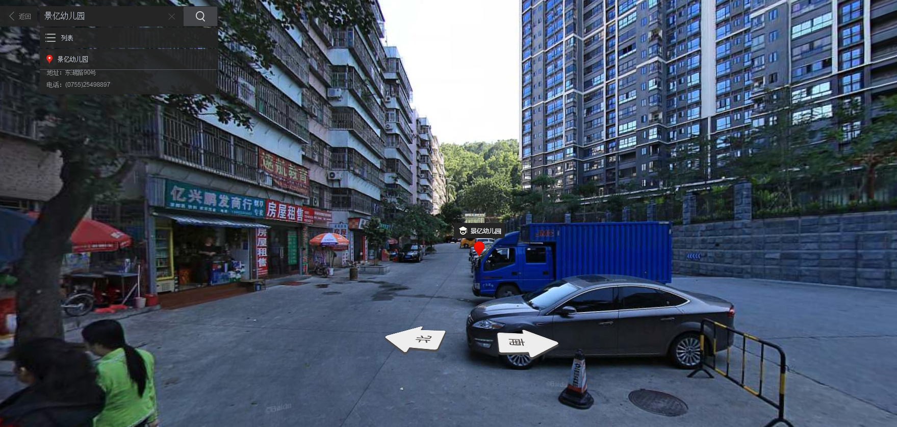 針對(duì)網(wǎng)帖的爆料內(nèi)容,記者查詢了百度全景地圖,以景億幼兒園作為第一視角,正對(duì)其大門的道路如該網(wǎng)友所言,一半以上被用來(lái)停車,而另一半則用來(lái)給行人和車輛共同通行。