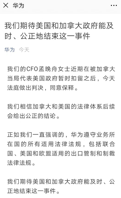 12月12日上午,華為發(fā)布聲明:期待美國和加拿大政府能及時(shí)、公正地結(jié)束這一事件