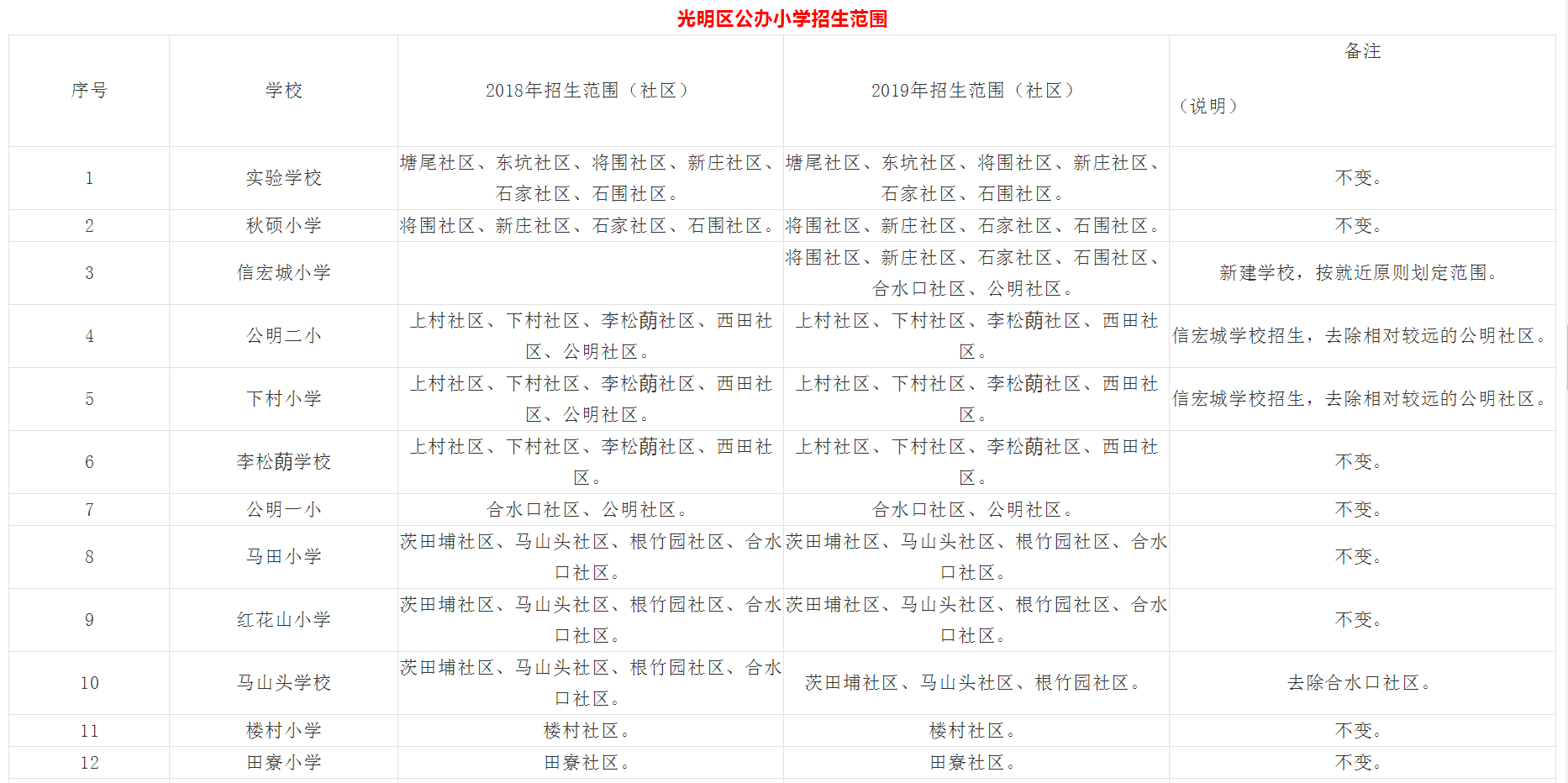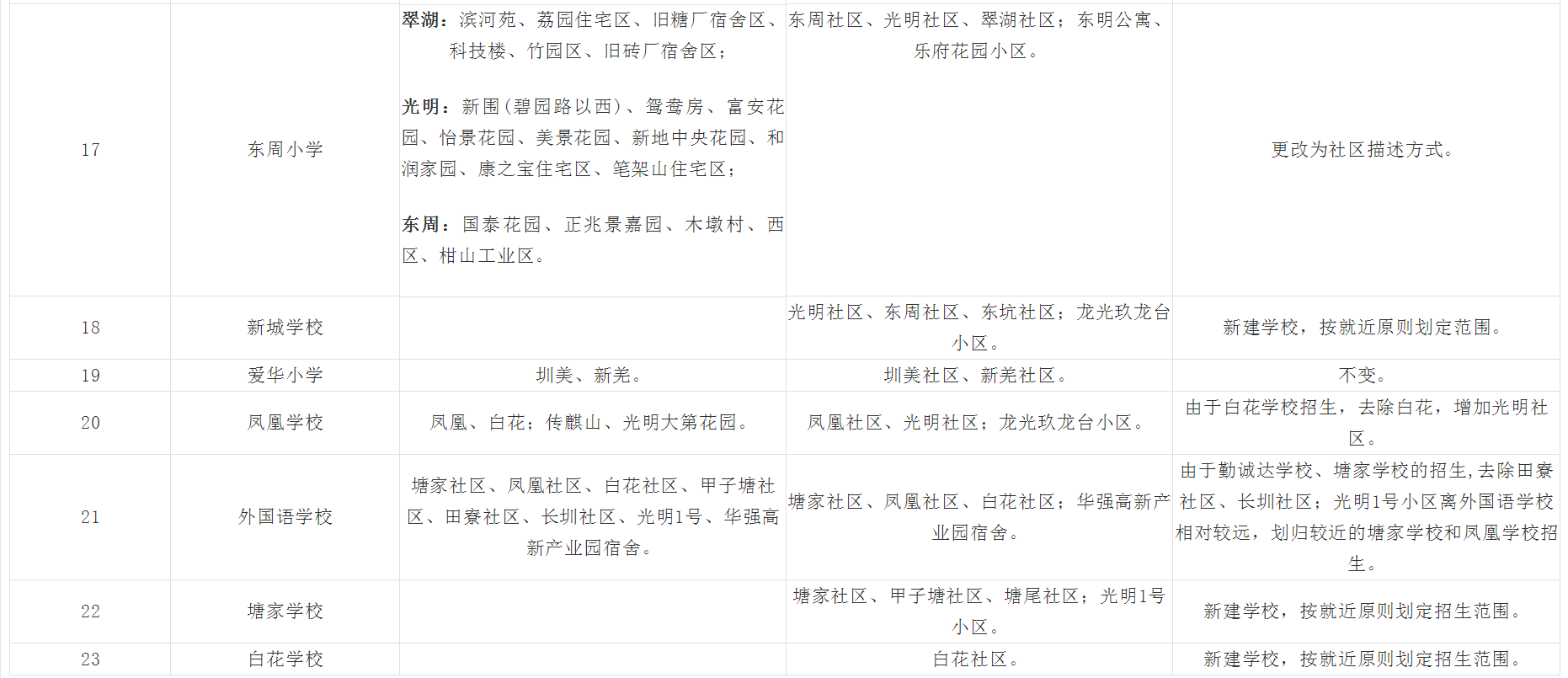 據悉,2019年光明區(qū)招生原則是原有學校招生范圍盡量保持不變,新增學校招生范圍根據招生規(guī)模、生源情況等按就近原則劃定。由于增加了勤誠達學校、信宏城小學、新城學校、塘家學校、白花學校等5所新建學校,鳳凰學校擴建項目也已完成,因此,招生片區(qū)擬做調整為:白花社區(qū)不再安排至光明中學;光明外國語學校招生去除田寮、長圳、甲子塘片區(qū);光明1號小區(qū)劃歸較近的塘家學校和鳳凰學校招生;馬山頭學校招生去除合水口片區(qū);光明第二中學招生去除相對較遠的塘尾片區(qū)。公明二小、下村小學招生去除相對較遠的公明社區(qū);長圳學校招生去除相對較遠的塘家社區(qū)、甲子塘社區(qū)。鳳凰學校招生去除白花,增加光明社區(qū)。