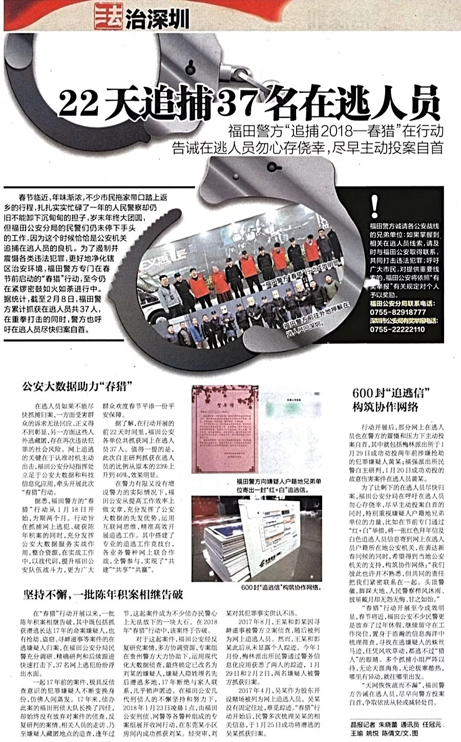 ★★春節(jié)臨近,萬家團圓,福田公安分局的民警卻更忙了。他們?yōu)榱硕糁普饝馗黝愡`法犯罪,凈化轄區(qū)治安環(huán)境,專門在春節(jié)前啟動“春獵”行動,劍指負案在逃的犯罪嫌疑人,行動截止2月8日,警方累計抓獲在逃人員37人。