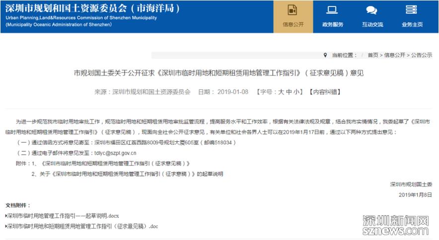 深圳新聞網(wǎng)2019年1月8日訊(記者 潘潤華)1月8日,市規(guī)土委起草發(fā)布《深圳市臨時用地和短期租賃用地管理工作指引(征求意見稿)》(以下簡稱“征求意見”)。根據(jù)該征求意見,社會投資主體組織實(shí)施的急需公共服務(wù)設(shè)施用地為短期租賃用地,需按照我市地價測算相關(guān)規(guī)則繳交租金。