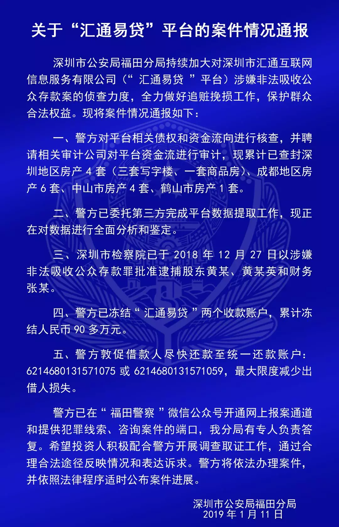 福田公安通報(bào)六家平臺(tái)涉嫌非法吸收公眾存款案的情況