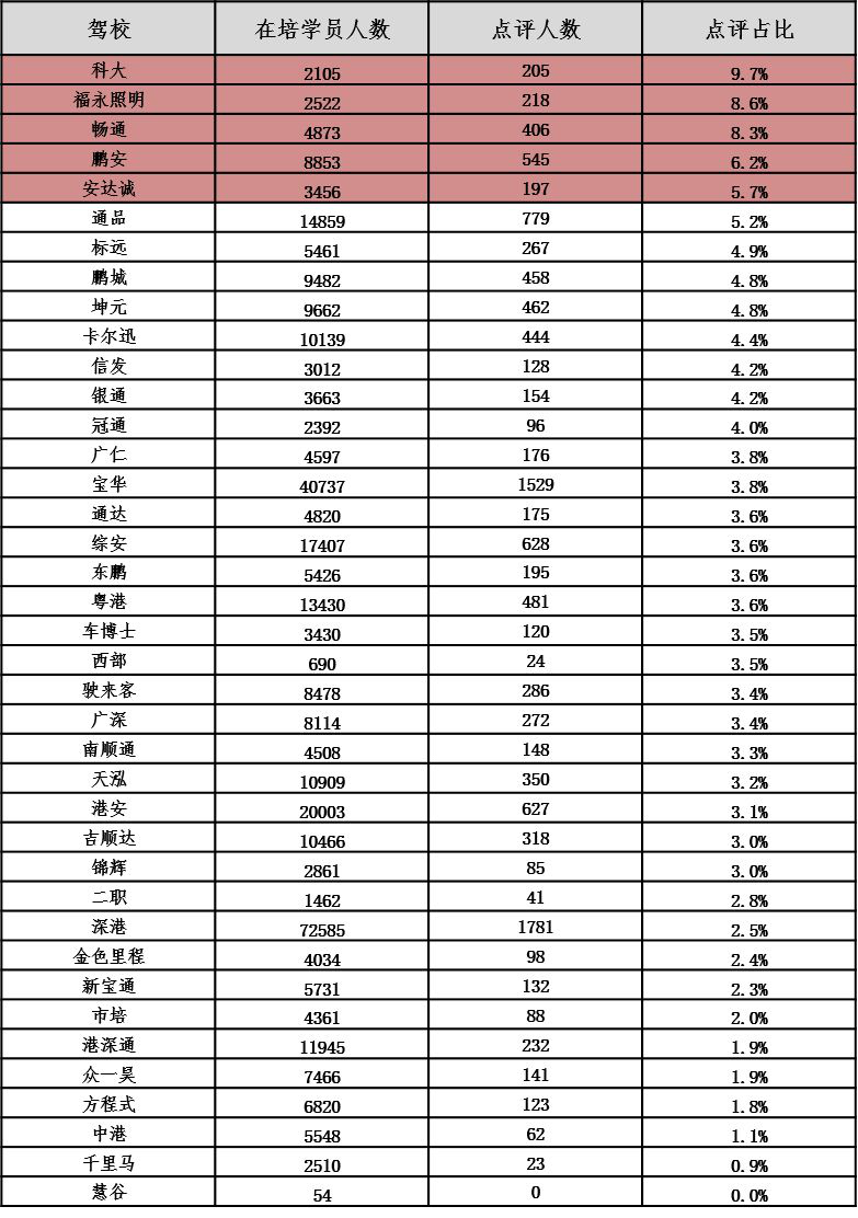▲為反映教練員真實(shí)情況,確保點(diǎn)評有效性,對第四季度各駕校學(xué)員點(diǎn)評占比進(jìn)行公布。
