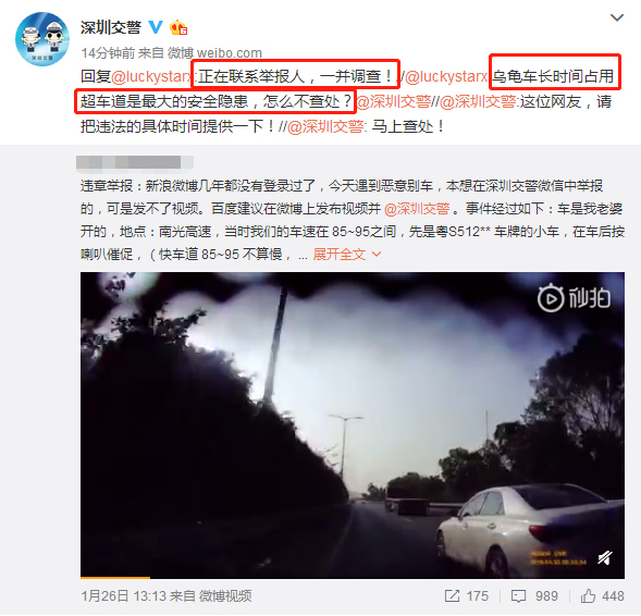 1月28日下午5點,深圳交警在微博上也給網(wǎng)友作出回復(fù),對于長時間龜速占用超車道的行為也將一并調(diào)查。
