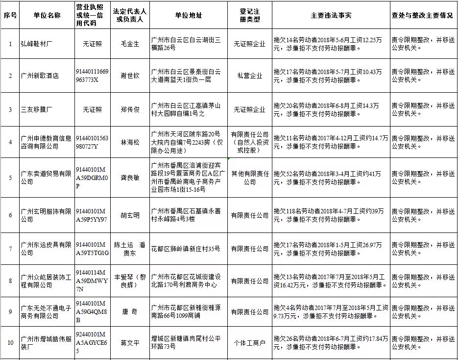 深圳新聞網(wǎng)2019年1月29日訊 (記者 劉婷)據(jù)廣東發(fā)布消息,省人社廳近日公布,2019年第一批用人單位重大勞動保障違法行為名單。到底是哪些企業(yè)在惡意欠薪?這些“老賴”企業(yè)的營業(yè)執(zhí)照、地址、法人等等超全信息都在這!