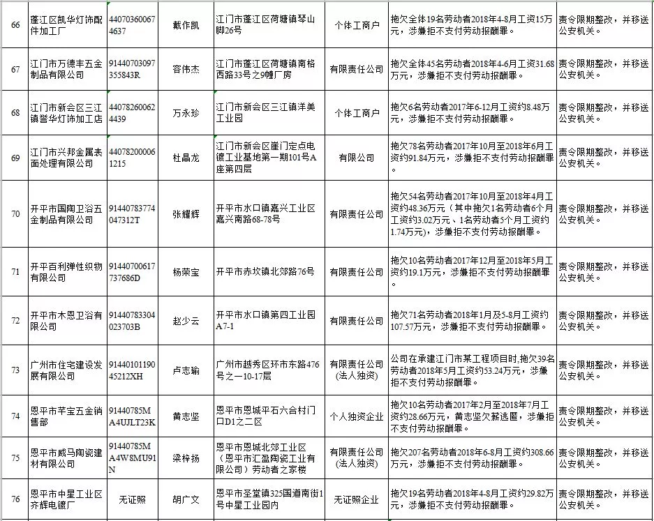 深圳新聞網(wǎng)2019年1月29日訊 (記者 劉婷)據(jù)廣東發(fā)布消息,省人社廳近日公布,2019年第一批用人單位重大勞動(dòng)保障違法行為名單。到底是哪些企業(yè)在惡意欠薪?這些“老賴(lài)”企業(yè)的營(yíng)業(yè)執(zhí)照、地址、法人等等超全信息都在這!