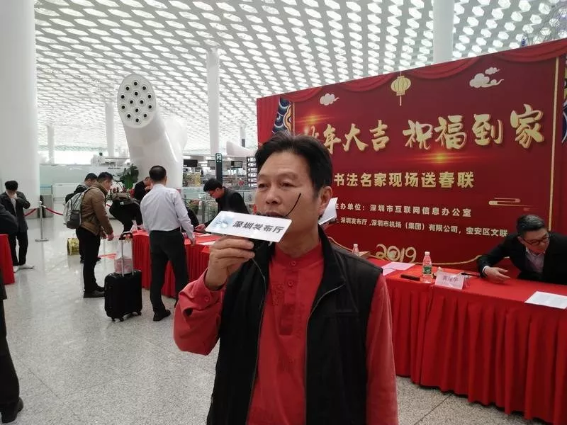 寶安區(qū)書法家協(xié)會(huì)主席李高揚(yáng)介紹,在機(jī)場(chǎng)送春聯(lián)很有意義,可以給全國(guó)各地的朋友們送上新年祝福。這次深圳發(fā)布廳攜手深圳機(jī)場(chǎng)舉辦活動(dòng),寶安區(qū)書法家協(xié)會(huì)集結(jié)高手出動(dòng)為群眾服務(wù),為市民送去祝福。他祝大家新春快樂,闔家幸福。