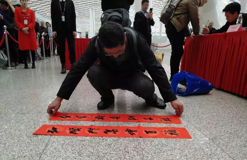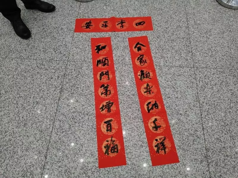 來自山東的譚先生剛從越南河內(nèi)務(wù)工回來,準(zhǔn)備轉(zhuǎn)機(jī)回山東煙臺,他選擇了“合家歡樂納千祥,和順門第增百福”,表達(dá)了他對家庭美滿的祝福。