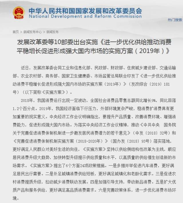 1月29日,發(fā)改委等部門印發(fā)《進一步優(yōu)化供給推動消費平穩(wěn)增長促進形成強大國內(nèi)市場的實施方案 (2019年 ) 》(以下簡稱《方案》)。