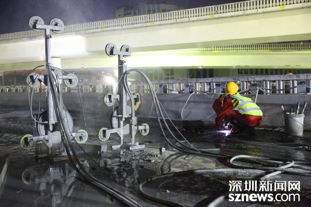 工人正對(duì)橋體進(jìn)行繩鋸切割。