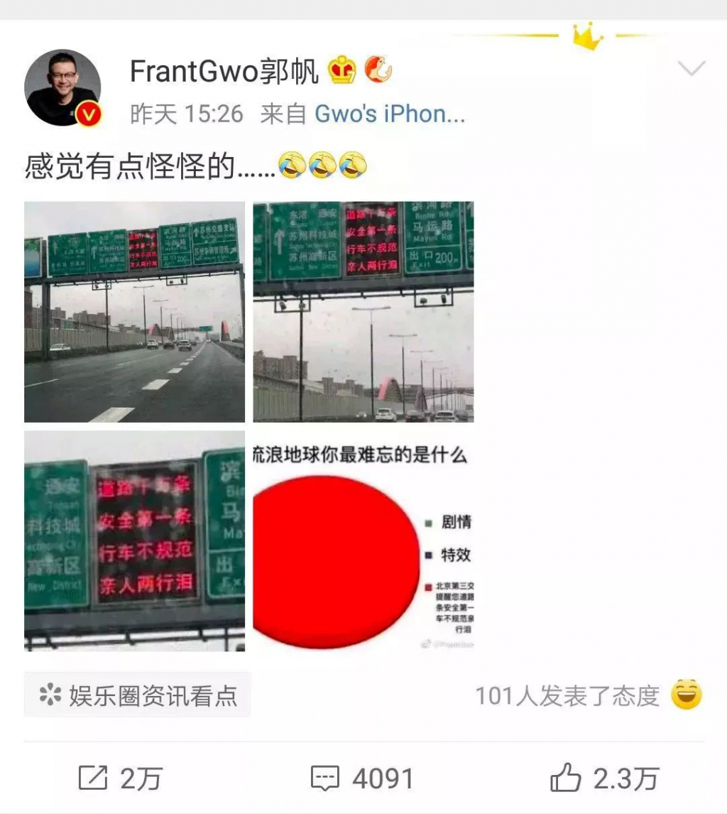 這些現(xiàn)實(shí)中的畫面,也把導(dǎo)演"驚動"了,郭帆導(dǎo)演發(fā)微博表示有點(diǎn)怪怪的。