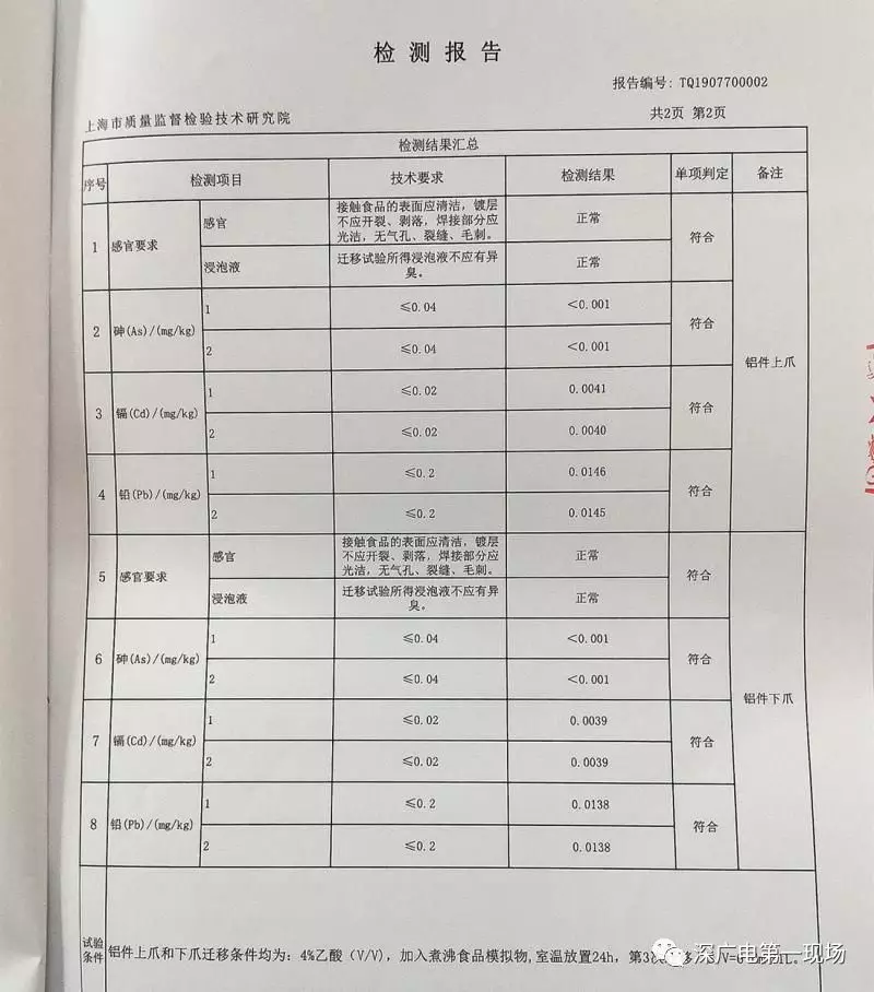 在現(xiàn)場,松江區(qū)市場監(jiān)管局還向記者出示了一份該局抽樣后委托上海市質(zhì)檢院進行檢測的檢測報告,檢測對象是“天使之橙”現(xiàn)榨橙汁機的上下爪,檢測依據(jù)就是上述的我國國家標(biāo)準(zhǔn)《食品接觸用金屬材料及制品》。經(jīng)檢測,相關(guān)部件的檢測項目均符合上述標(biāo)準(zhǔn)。