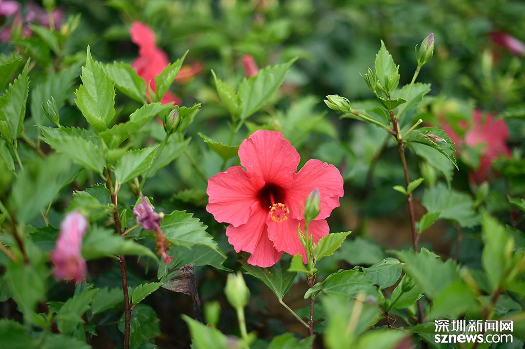 大紅花在綠葉的襯托下格外顯眼,充滿春天氣息