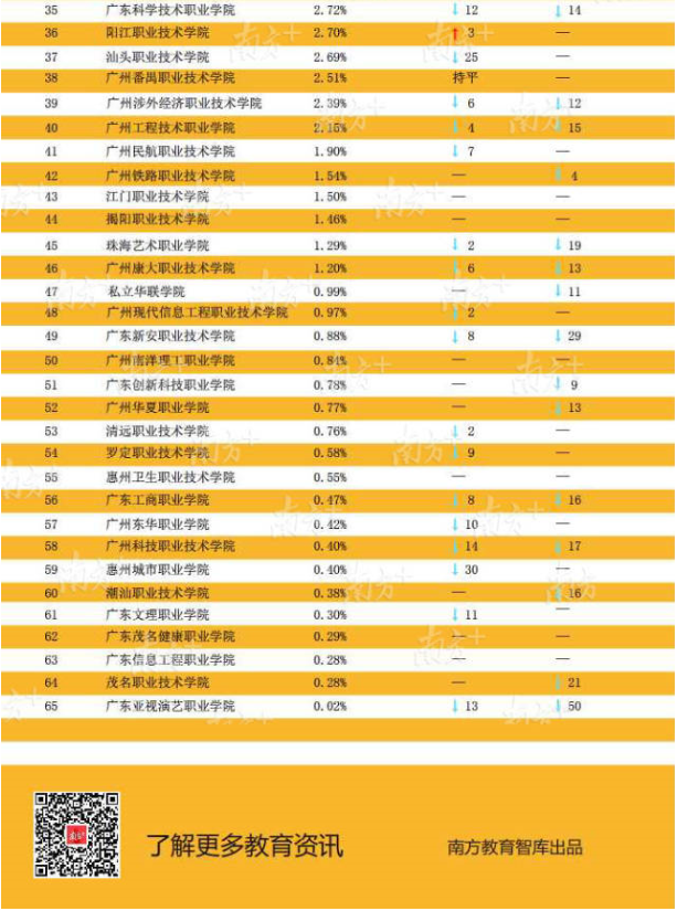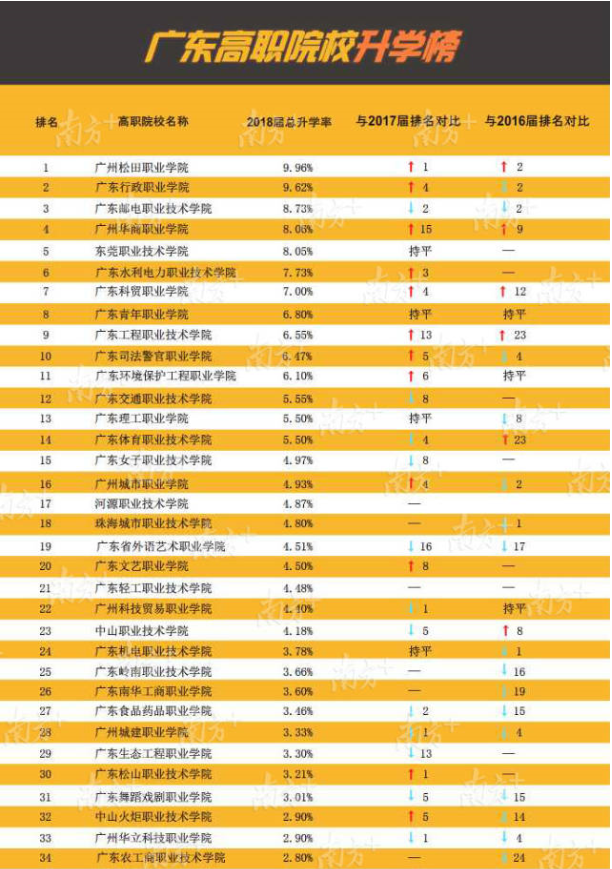 近3年各高職升學(xué)數(shù)據(jù)顯示,越來越多畢業(yè)生通過升學(xué)提升自身競爭力,尤其2018屆升學(xué)率增長明顯。其中有7所高職院校的畢業(yè)生升學(xué)率達到或超過7%,分別是廣州松田職業(yè)學(xué)院9.96%、廣東行政職業(yè)學(xué)院9.62%、廣東郵電職業(yè)技術(shù)學(xué)院8.73%、廣州華商職業(yè)學(xué)院8.06%、東莞職業(yè)技術(shù)學(xué)院8.05%、廣東水利電力職業(yè)技術(shù)學(xué)院7.73%和廣東科貿(mào)職業(yè)學(xué)院7.00%。