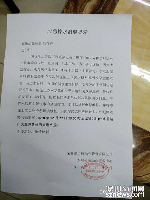 據(jù)了解,自本網(wǎng)報(bào)道此事件后,沙頭角街道便聯(lián)動(dòng)?xùn)|埔福苑小區(qū)物業(yè)公司于2018年12月26日發(fā)布小區(qū)應(yīng)急停水公告。公告表示,將盡快解決供水管漏水問題,在停水后將主管道水內(nèi)全面排除,進(jìn)行電焊維修,并在滲漏水彎頭處應(yīng)急焊接修復(fù)。為保障施工順利進(jìn)行,小區(qū)停水時(shí)間為:2018年12月27日13:00至17:30。