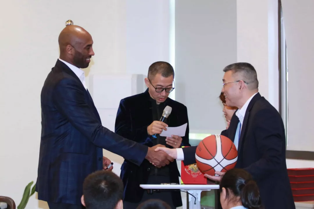 在課室里,南山區(qū)與科比互贈禮物表達(dá)情誼和祝福: