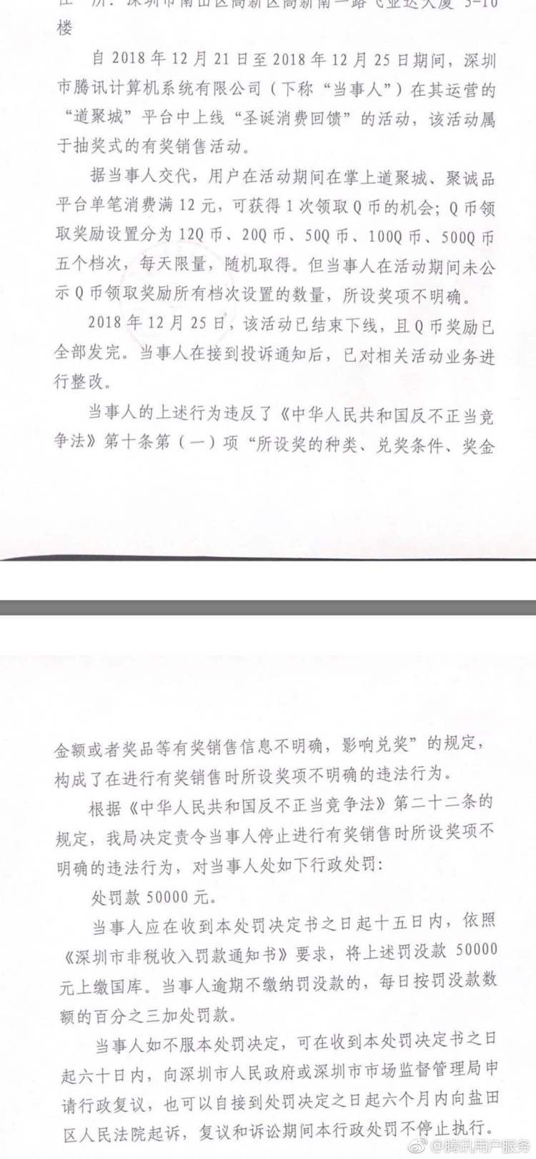 為解答網(wǎng)友疑惑,當(dāng)天晚間,微博賬號騰訊用戶服務(wù)公開發(fā)布了該處罰決定書,決定書中提到,2018年12月21日 -25日期間,深圳市騰訊計算機(jī)系統(tǒng)有限公司(下稱"當(dāng)事人")在其運(yùn)營的"道聚城"平臺中上線"圣誕消費(fèi)回饋"的活動,該活動屬于抽獎式的有獎銷售活動。