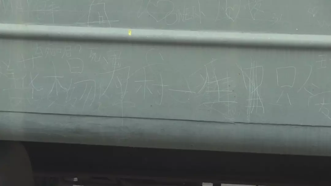 今天中午,記者來(lái)到現(xiàn)場(chǎng),看見(jiàn)兩節(jié)火車(chē)的車(chē)廂上都有多處被不文明涂寫(xiě)的痕跡。有些痕跡是用手指直接涂寫(xiě)的,有些則是用尖利器物刻寫(xiě)。內(nèi)容大都是刻上名字,表達(dá)愛(ài)意,到此一游,甚至是寫(xiě)詩(shī)。
