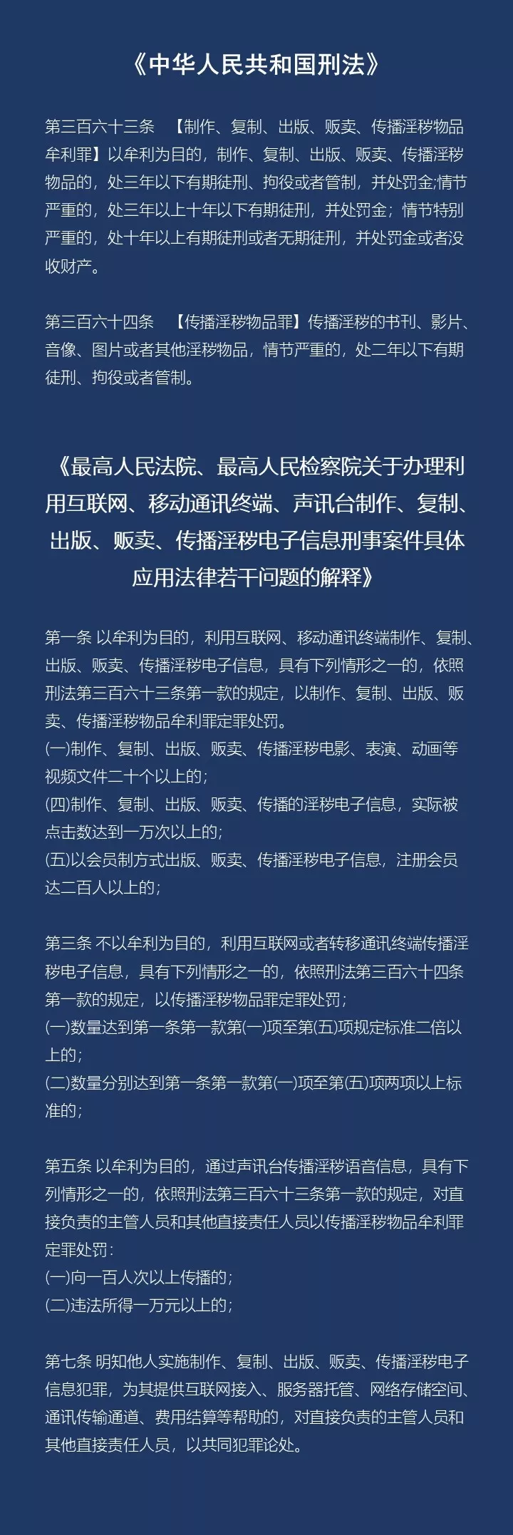 我國《刑法》規(guī)定了對傳播淫穢物品牟利罪、傳播淫穢物品罪的處罰,而最高法、最高檢2004年9月出臺的《關于辦理利用互聯網、移動通信終端、聲訊臺制作、復制、出版、販賣、傳播淫穢電子信息的刑事案件具體應用法律若干問題的解釋》,又對此類犯罪認定做了詳細的解釋。
