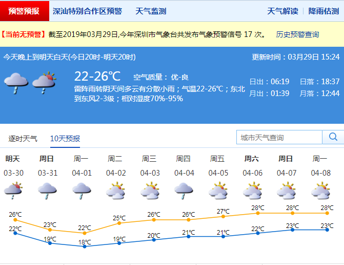 深圳新聞網(wǎng)2019年3月29日訊 記者從深圳氣象局了解到,昨天夜間到今天白天,我市多云,夜間到早晨有輕霧,局地大霧;早晨最低氣溫22-23℃,白天最高氣溫27-28℃;相對濕度70%-100%;南風2-3級;昨天夜間能見度1-5公里。東部局地有大霧能見度在1公里以下,白天能見度轉好達到10-20公里。