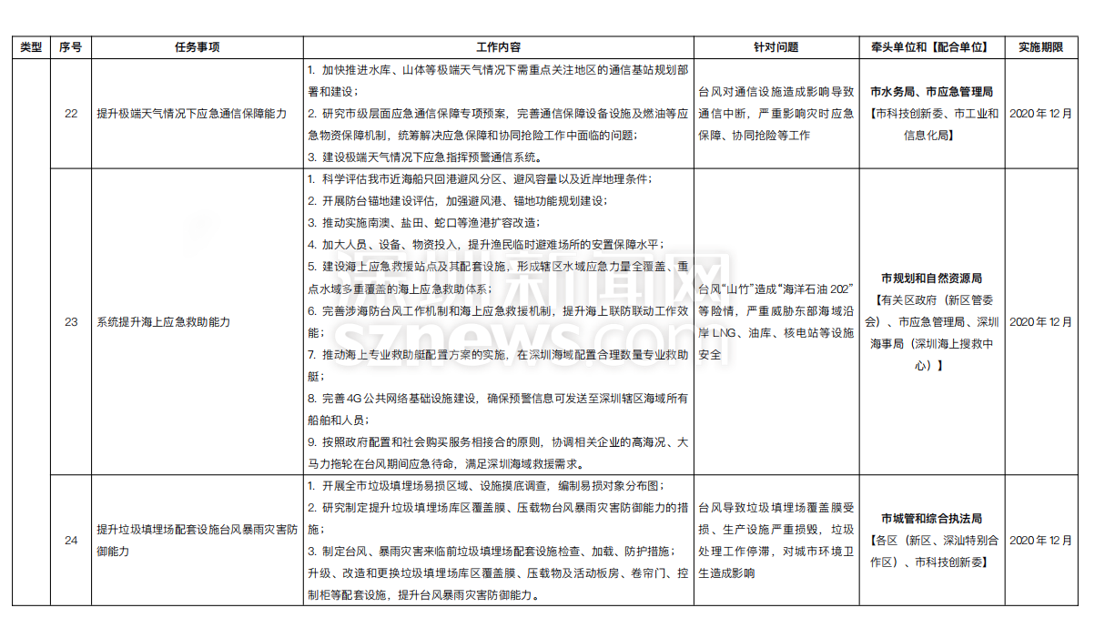 附:《深圳市提升臺風(fēng)暴雨災(zāi)害防御能力重點任務(wù)實施方案一覽表》