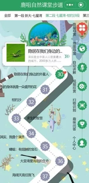 隨著綠道行進(jìn)的深入,記者來到第一個自然觀察研習(xí)點,這里配置有自然研習(xí)導(dǎo)賞標(biāo)識牌,牌上有植物動物的照片及介紹,牌子的角落有供游客學(xué)習(xí)的二維碼。記者了解到,新區(qū)同時開發(fā)建立一套APP自然課堂學(xué)習(xí)系統(tǒng),在綠道全程配套建設(shè)64個實地自然觀察研習(xí)點,設(shè)置了260余個自然研習(xí)導(dǎo)賞標(biāo)識,接入專業(yè)智能識別軟件,配以體量龐大生物影像數(shù)據(jù)庫。掃碼進(jìn)入APP就可以通過文字、圖片和音像資料了解到“大鹿線”全景介紹和分區(qū)介紹,以及物種相關(guān)知識。同時,該系統(tǒng)利用手機(jī)GPS定位技術(shù),為行進(jìn)中的市民游客自動講解所到之處的自然課堂語音課程。來自羅湖的資深驢友李先生告訴記者,來“大鹿線”徒步,不僅鍛煉身體愉悅心情,還可以學(xué)到豐富的自然知識,打開APP行走全程,猶如參觀了一座多維一體的山海“全景博物館”。