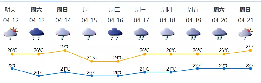 13日有陣雨,部分時(shí)間雨勢較大,氣溫20-26℃;14日有小雨到中雨,氣溫21-27℃;15-16日天氣仍不穩(wěn)定。