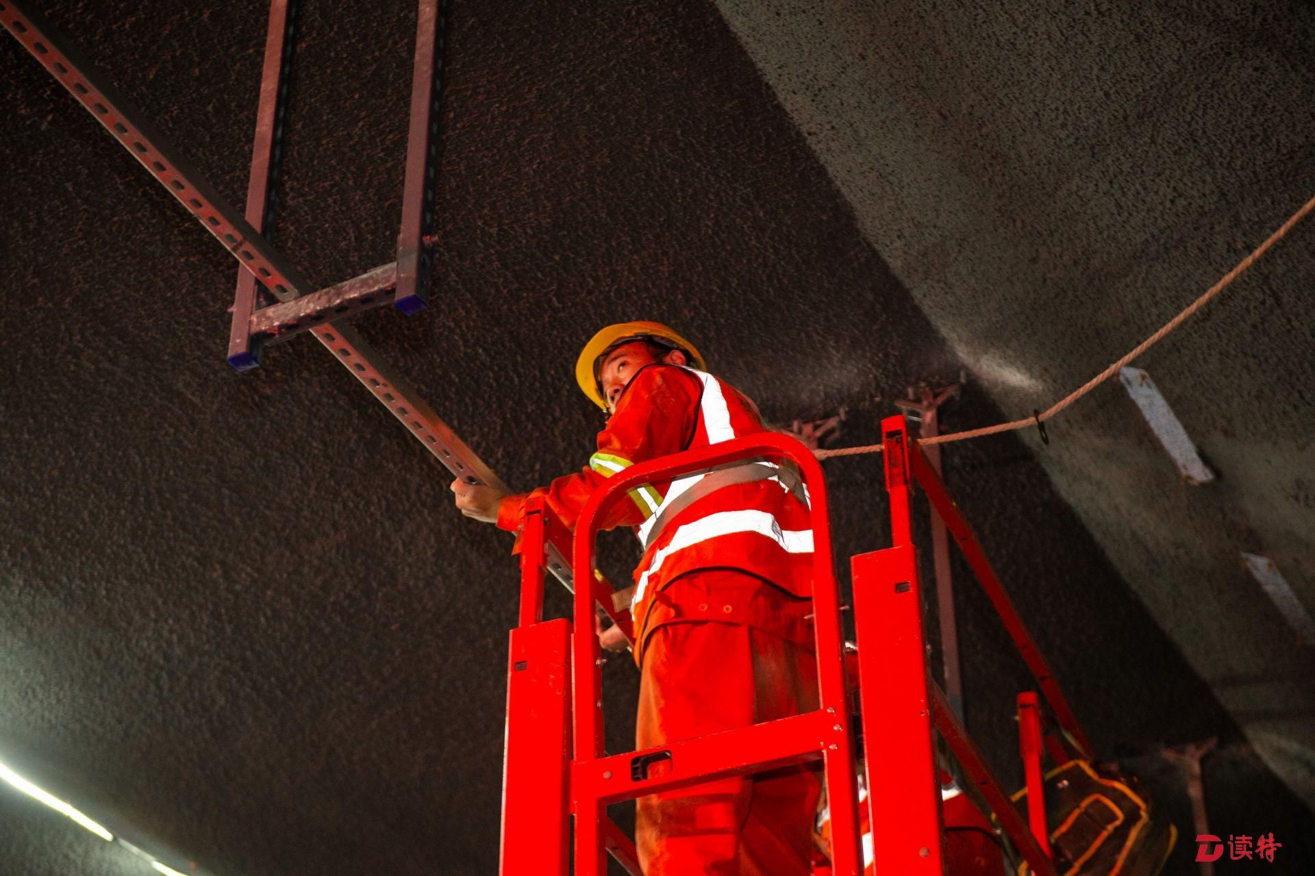 工人在安裝燈具滑槽。